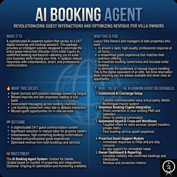 AI system that acts as a 24/7 digital concierge and booking assistant for villa owners. Instead of owners answering messages all day, the AI handles: • guest inquiries • availability questions • booking conversions • upsells • guest support The owner simply receives confirmed bookings.